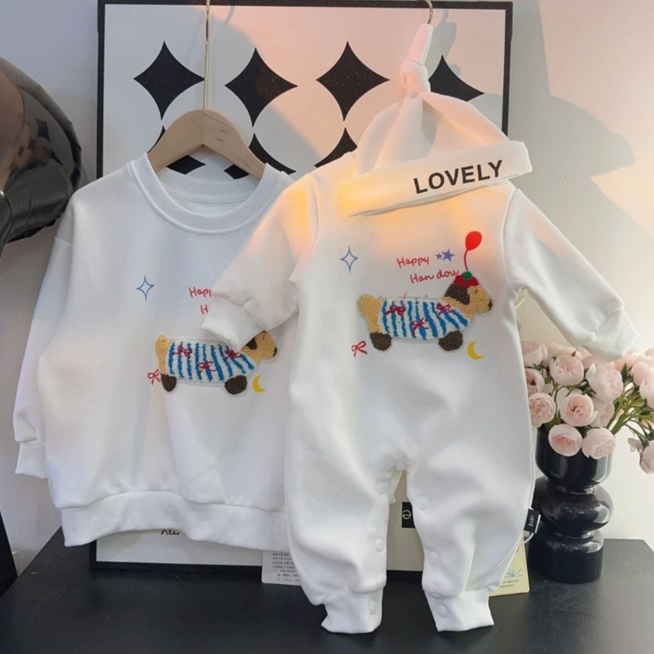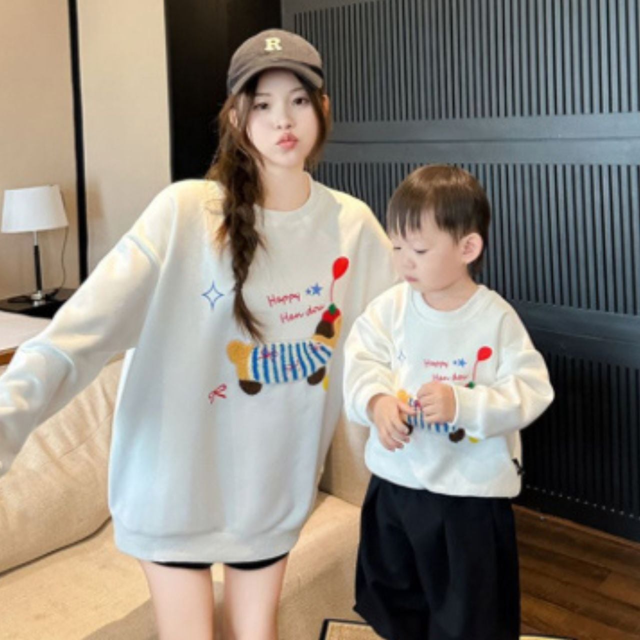 可愛らしさの中に落ち着きを感じる配色で、大人にも子ども にも自然に馴染むデザインです。 ほどよくゆとりのあるシルエットは、動きやすさと抜け感を両立。